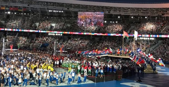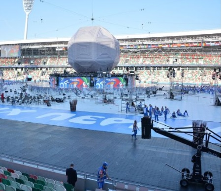 На церемонии открытия обыгрывалось прошлое Белоруссии, сейчас уже речь о современности. На экране табло мелькают логотипы современных компаний страны.