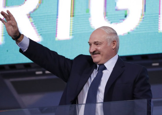 Президент Белоруссии Александр Лукашенко приветствует спортсменов.