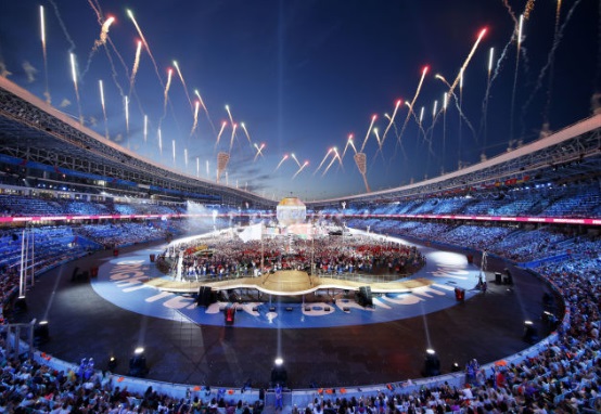Завершился парад спортсменов. Все прошли по стадиону и теперь расположились напротив своих национальных флагов. Сейчас начнется само шоу.