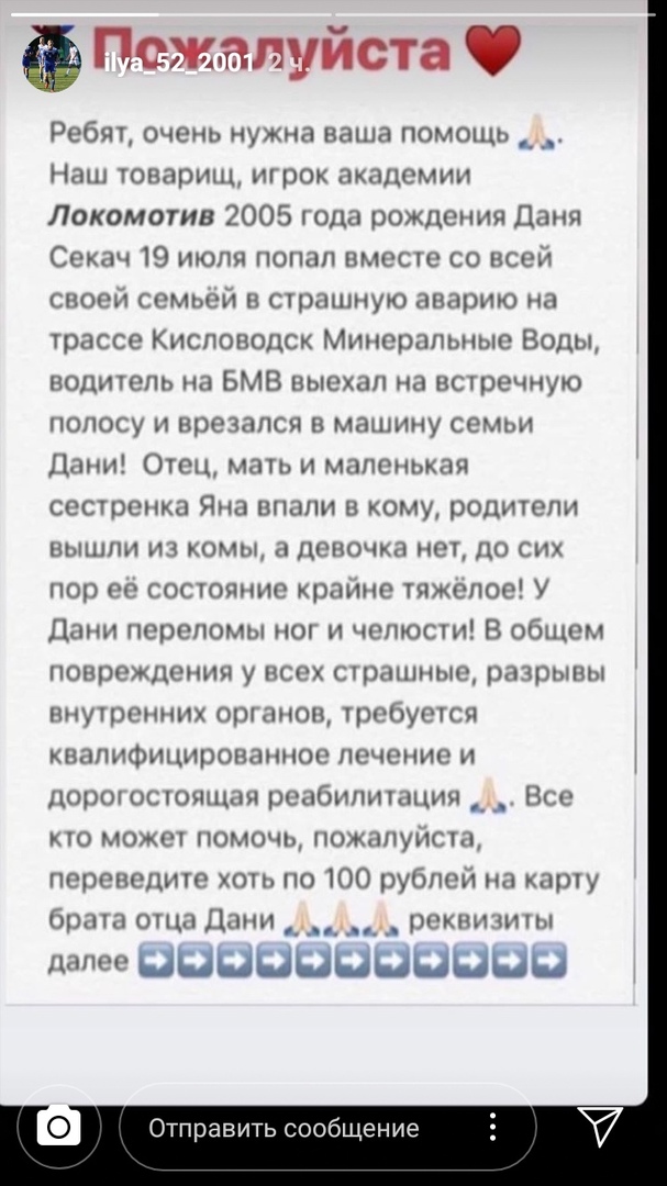 В социальных сетях уже начался сбор средств на дорогостоящее лечение семьи футболиста. В частности, родители подопечных Секача-старшего из клуба «Арсенал-2005» собираются оказать посильную финансовую поддержку.