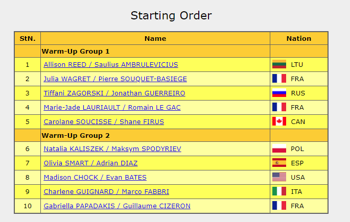 Первая группа участников появляется на льду для разминки: Эллисон Линн / Саулюс Амбрулевичюс (Литва), Джулия Вагрет / Пьер Сукке (Франция), Тиффани Загорски / Джонатан Гурейро (Россия), Мари-Жаде Лорьо / Ромен Ле Гак (Франция), Кэролайн Сусис / Шейн Фирус (Канада).
