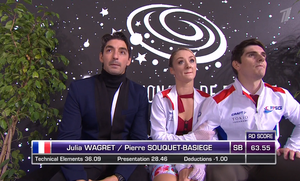 63,55 балла получают. Вполне себе адекватные оценки. По поводу падения после вращательной поддержки даже посмеялись с тренером.