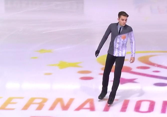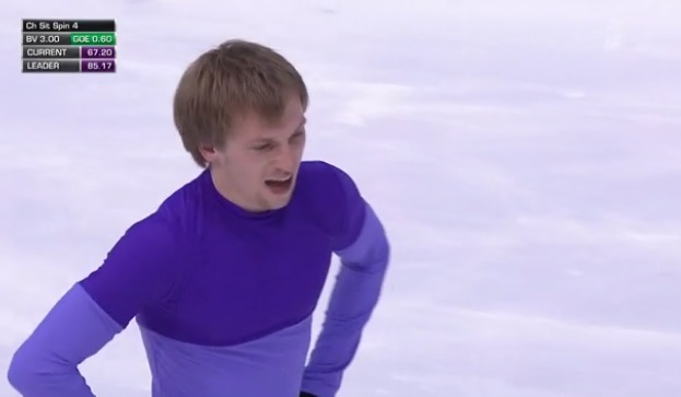 Сделал сразу же четверной тулуп, потом был каскад 3 аксель — 3 тулуп, вращения четвертого уровня. Первая ошибочка была при выезде с тройного риттбергера. Дорожку шагов оценили третьим уровнем, зато хорошо исполнил каскад 3 риттбергер — 2 тулуп — 2 риттбергер. Еще прыгнул двойные лутц и сальхов. Завершил вращениями четвертого уровня.