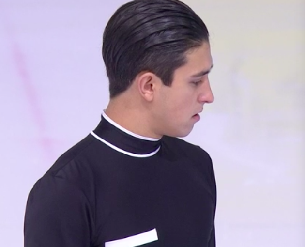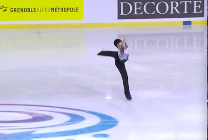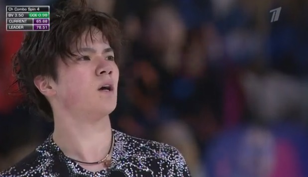 Включил в программу четверной тулуп, чтобы побороться за бронзу, но упал с него. Зато тройной аксель вышел неплохим. Каскад 3 лутц — 2 тулуп. Тройной риттбергер сделал, а вот на каскаде вышел степ-аут на 3 аксель, после чего сальхов сделал только двойным. Тройной лутц с минусом сделал. Вращения и дорожка в основном третий уровень получили. Еще в конце был каскад 3 тулуп — 2 сальхов с небольшим минусом. Публика бурно поддерживает, но прокат очень средний.