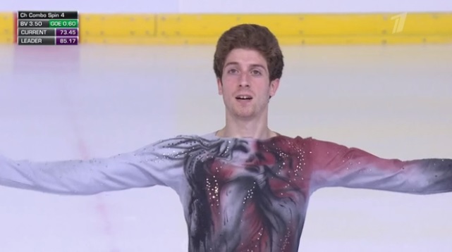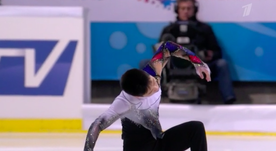 Еще одна ошибочка — Надо коснулся рукой льда при выезде с тройного акселя. В остальном пока что все чисто, хотя немного странно видеть у мужчины элементы типа тройной риттбергер + двойной тулуп + двойной тулуп.