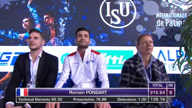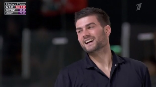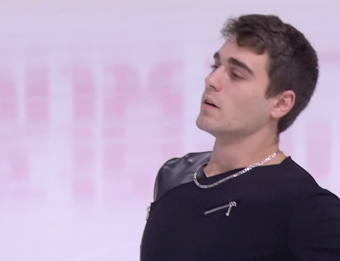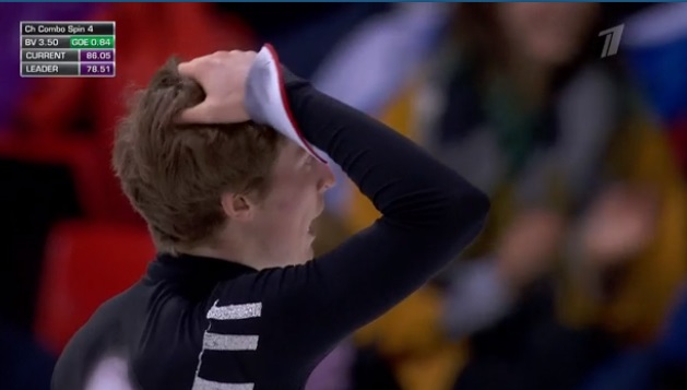 Сразу ошибка на четверном тулупе, ошибка на выезде с каскада 4 тулуп — 3 сальхов. А вот каскад 3 аксель — 2 тулуп сделал чисто и с плюсом, как и тройной риттбергер. Хороший тройной аксель, но ошибка на тройном лутце. Зато во второй половине программы чистый каскад 3 флип — ойлер — 3 сальхов. Сильный прокат! Расчувствовался сам француз!