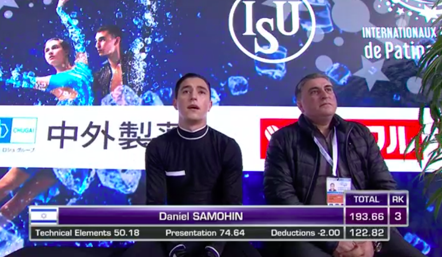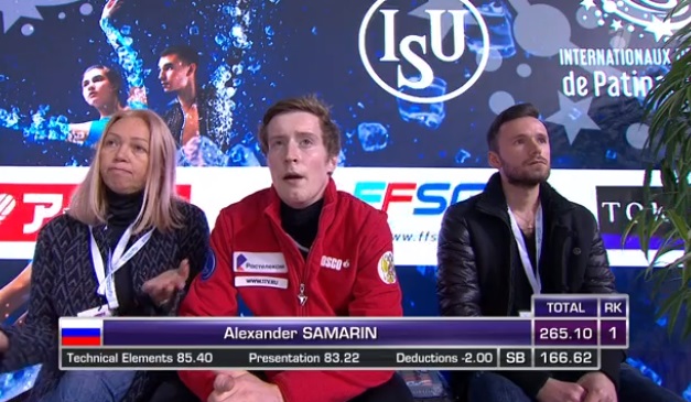 На втором промежуточном месте расположился россиянин Александр Самарин, которому удалось исполнить каскад четверной лутц + тройной тулуп, четверной флип и тройной аксель (тоже с ошибкой). Оценка россиянина — 98,48.
