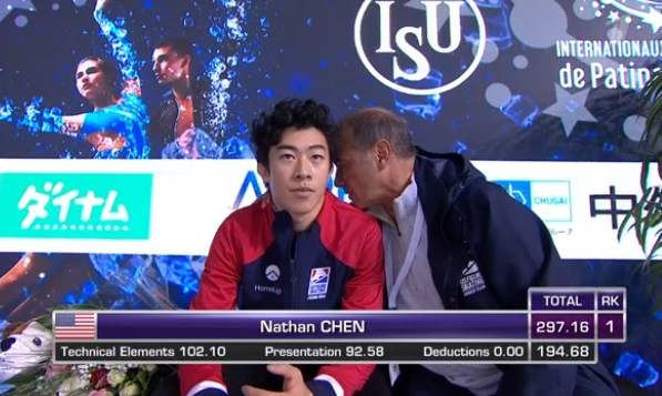 Набор прыжков Чена: четверной лутц, каскад 3 лутц — 2 тулуп, каскад 4 тулуп — ойлер — 3 флип, тройной аксель, четверной сальхов с приземлением на две ноги, четверной тулуп с ошибочкой на выезде, каскад 3 аксель — 2 тулуп. Уверенные дорожки и вращения. Чен выиграет свой второй этап и квалифицируется в финал сегодня.