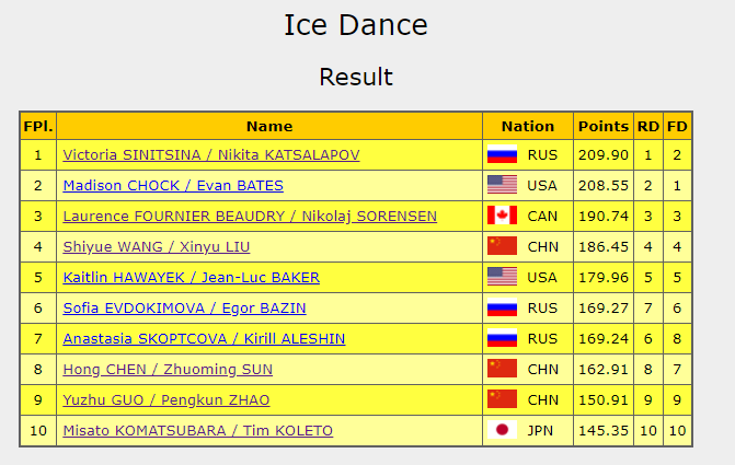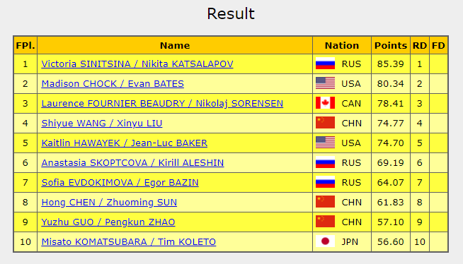 goldenskate.comЧто ж, подводим итоги. Синицина и Кацалапов впервые в карьере выигрывают этап Гран-при, чуть больше, чем на балл, опережая сильнейший американский дуэт Чок / Бейтс. Это действительно очень крутое достижение для наших фигуристов. Полная таблица выглядит следующим образом: