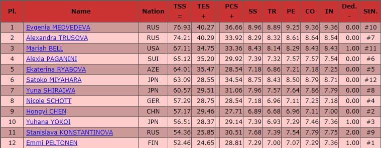 Итак, Евгения Медведева выигрывает короткую программу. Александра Трусова — вторая, Станислава Константинова осталась предпоследней.