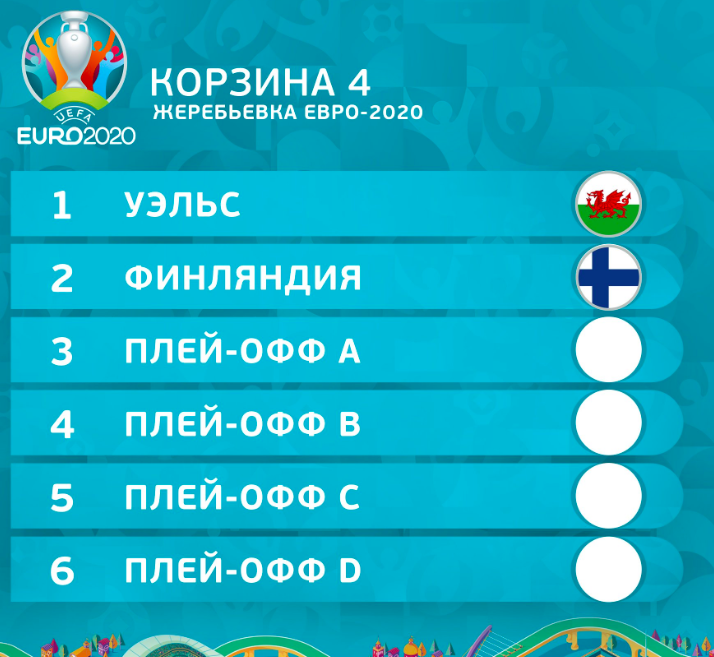 И наконец распределение команд из четвертой корзины. Там пока точно известны только Уэльс и Финляндия. Еще четыре представителя этой корзины определятся после плей-офф Лиги наций в марте 2020 года:
