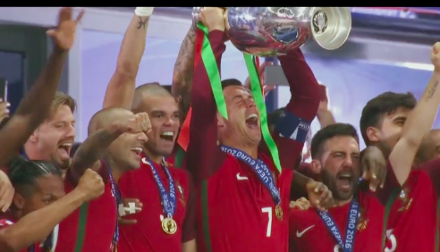 Теперь нам демонстрируют самые яркие моменты чемпионата Европы — 2016, на котором победу одержала Португалия, в финале переигравшая хозяев турнира — французов. Это было что-то невероятное.
