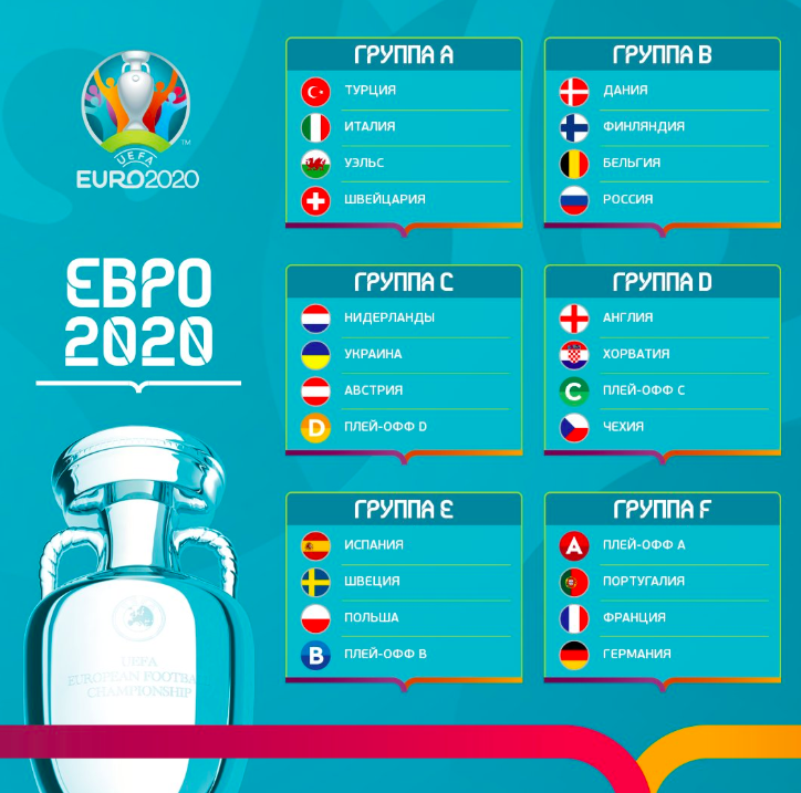 Россия узнала всех соперников по группе B на чемпионате Европы 2020 года — это Бельгия, Дания и Финляндия.