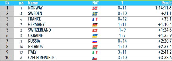 У Швеции серебро с отставанием от Норвегии 21,1 секунды. Франция выигрывает бронзу, отстав от лидера на 33,1 секунды.