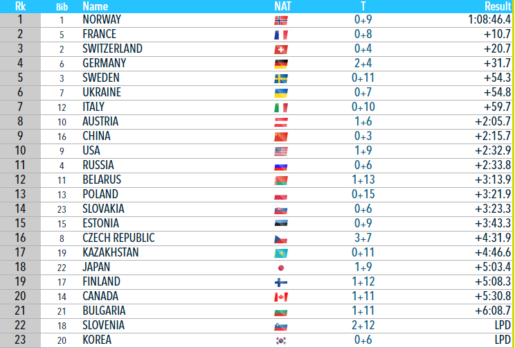 Тотальное преимущество Норвегии. И это при том, что на первом этапе норвежки откровенно провалились. Но Тириль Экхофф привела свою сборную не только к медалям, но и к победе. Франция ожидаемо в призах. Россия, к сожалению, тоже ожидаемо очень низко.