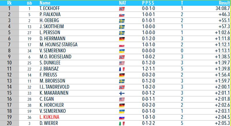 All alone, Eckhoff will have a big margin as Oeberg and Wierer both run a penalty loop and now it's Fialkova in second #RUH20 pic.twitter.com/kvKf1F1tfl