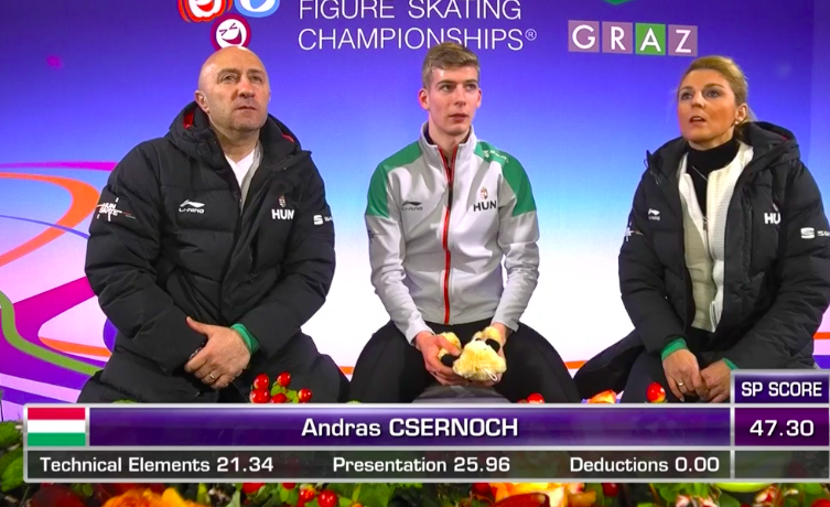 Даже с тройным риттбергером у Андраша возникли проблемы — он скрутил только два оборота. Ну, хотя бы финальный двойной аксель удался венгру нормально.