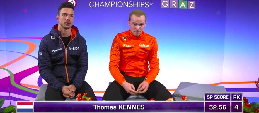 Время выступать голландцу Томасу Кеннесу! Он катается под очень нежную композицию «The Prayer» в бирюзовой рубашке.
