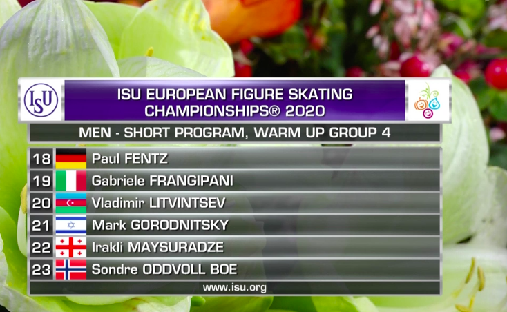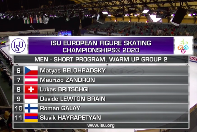 Последняя группа участников выходит на лед для разминки: Александр Самарин (Россия), Дмитрий Алиев (Россия), Денис Васильев (Латвия), Кевин Аймоз (Франция), Морис Квителашвили (Грузия), Маттео Риццо (Италия).