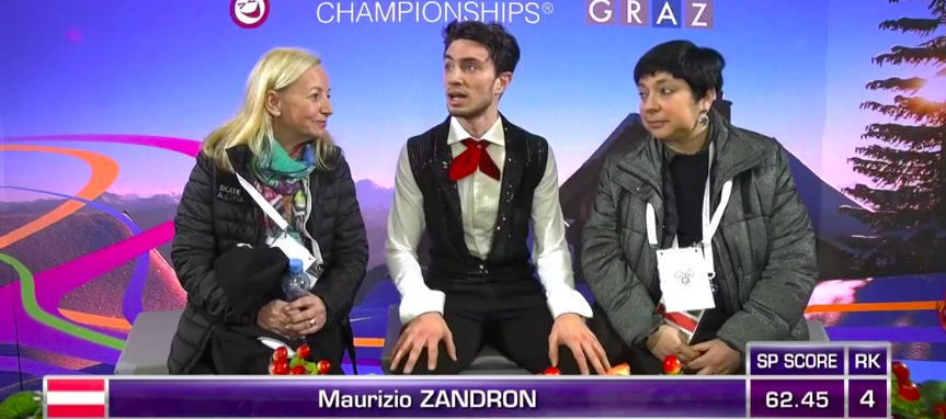 Следующим катается Маурицио Зандрон из Австрии! Он выбрал для выступления «That's Life» (Shawn James) и «In the Swing» (Imperial Swing Orchestra). Публика приветствует своего фигуриста продолжительными аплодисментами и ободрительными криками.