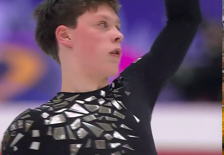 ЧТО ПРОИСХОДИТ?! Чистейший четверной лутц демонстрирует Ларри! Первый квад на этом турнире — и сразу на таком высоком уровне, с солидной надбавкой за исполнение. Зрители аплодируют в шоке.