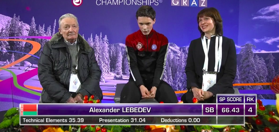 Следующим выступает Александр Лебедев из Белоруссии — бывший россиянин, тренирующийся у Виктора Кудрявцева. Спортсмен выбрал для проката оригинальный комбинезон с блестящими вставками по всему телу, напоминающими осколки стекла. Музыка — современная версия «Тоски» Джакомо Пуччини.