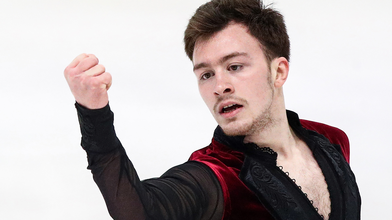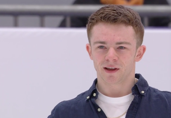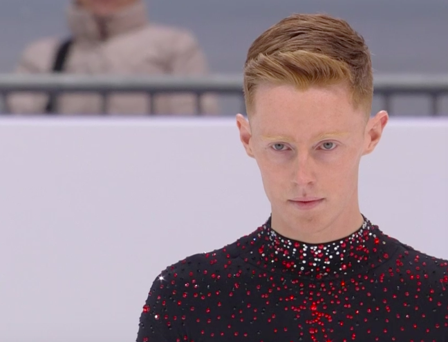 На льду — Конор Стэйклум из Ирландии! Рыжеволосый фигурист катается под композицию «Nightshade» (The Lumineers) в темном костюме с красными блестками.