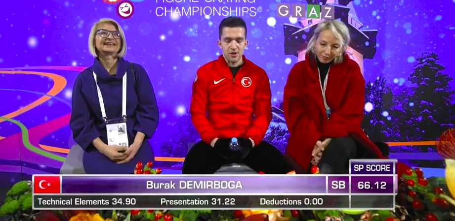 Турок показывает отменный тройной аксель — второй чистый элемент ультра-си на данный момент в турнире! Стройный восточный фигурист так легко взлетел в воздух и скрутил три с половиной оборота, что явно получит за этот элемент солидную надбавку по баллам.