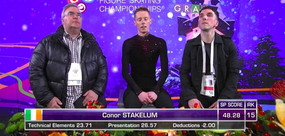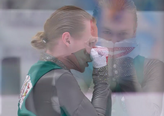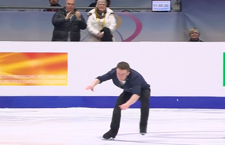 Этот ирландский Конор пока не так велик в спорте, как Макгрегор. Фигурист падает после второго прыжка в каскаде тройной тулуп + тройной тулуп, сильно недокручивает тройной риттбергер, из-за чего ему приходится спасаться от второго падения, подставляя другую ногу (степ-аут). И, наконец, он завершает выступление сильно позже музыки, что карается снятием одного балла. Оценка, конечно, довольно низкая: