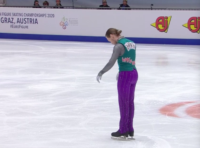 Чистый каскад четверной сальхов + тройной тулуп, грубая помарка на тройном акселе (какой раз за сегодня?) и очень жесткое падение на четверном тулупе. Ох, марафон ошибок какой-то сегодня.