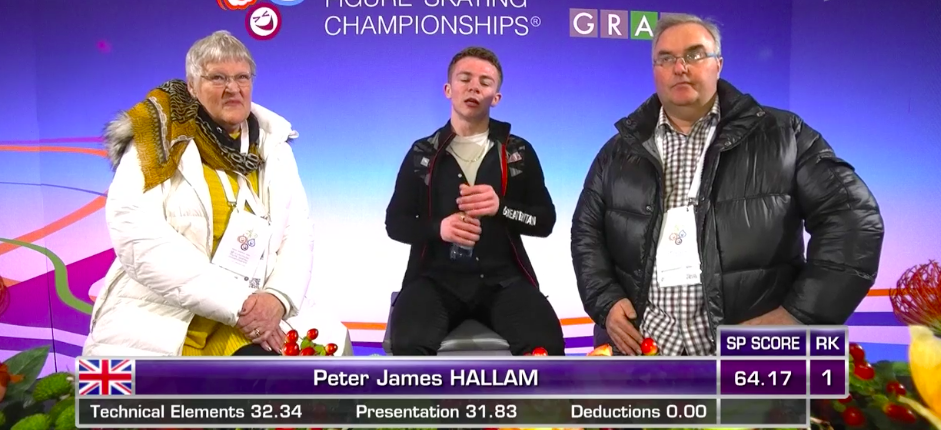 На лед выходит Питер Джеймс Халлам из Великобритании! Он катается под очень зажигательную «Foot Loose» и с ходу начинает невероятно быстро и с задором рассекать каток, даже подпрыгивая в горизонтальный шпагат. Это невероятно заводит публику.