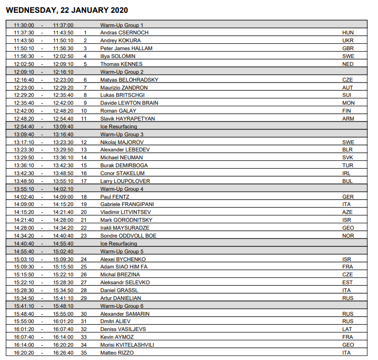 Всего в турнире принимают участие 35 одиночников из 26 стран. Они будут разделены на шесть разминко, и одна только короткая программа будет длиться пять (!) часов — настоящий марафон для зрителей. Изображение расписания увеличится по клику: