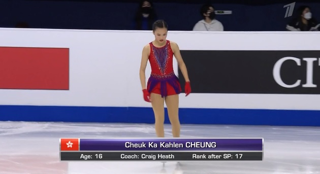 На льду вторая участница, Чук Ка Кален Чунг из Гонконга. Она упала на разминке.