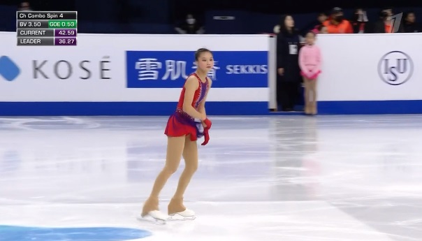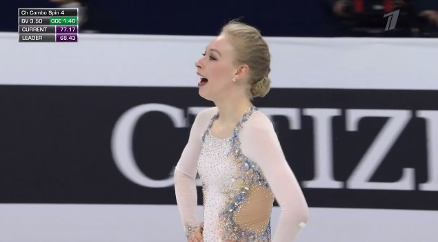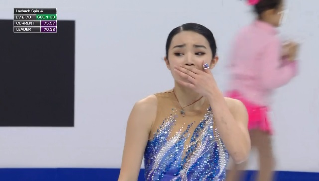 3 лутц — 3 тулуп в начале, дальше 2 аксель — 3 тулуп и тройной флип — все на хорошие плюсы. Следом Ким делает чистый тройной риттбергер. Во второй части проката двойной аксель, за дорожку шагов получила третий уровень. Наотмашь прыгнула тройной лутц и доборолась на приземлении, потеряв совсем чуть-чуть. Тут же отличный каскад 3 сальхов — 2 тулуп — 2 риттбергер! Ну и вращения четвертого уровня напоследок. Ну, это точно новый лидер. Классно справилась со своей сложной программой! Подзаполнившиеся трибуны ликуют!