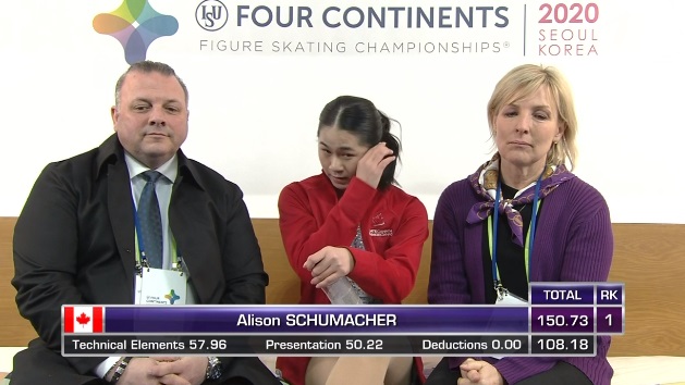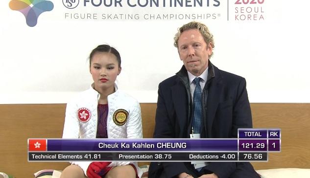 Оценки Чук Ка Кален Чунг. Она на очень промежуточном первом месте. Но только за счет короткой, потому что произвольную проиграла. Еще бы — с -4 за падения!