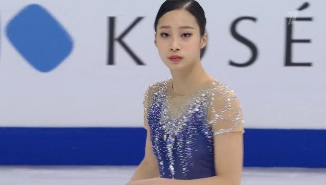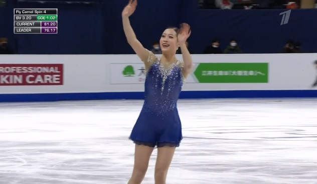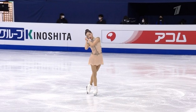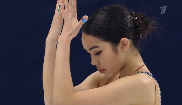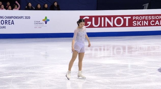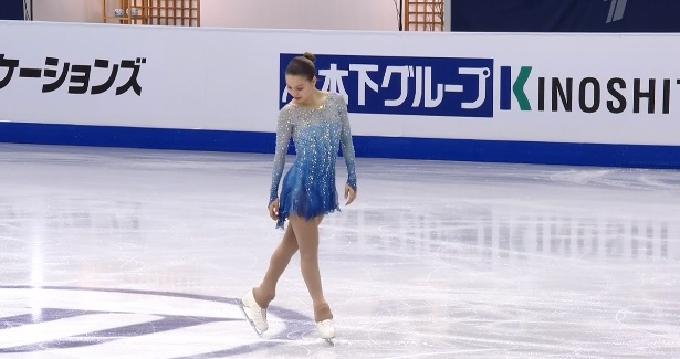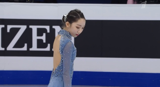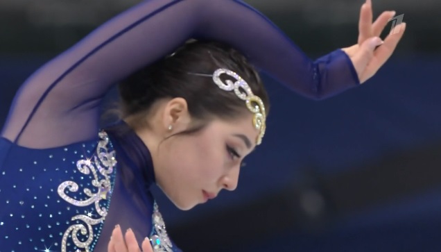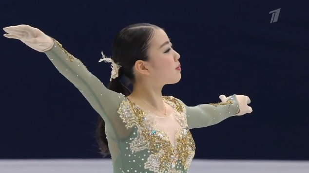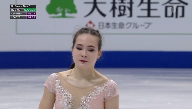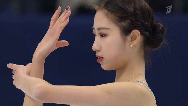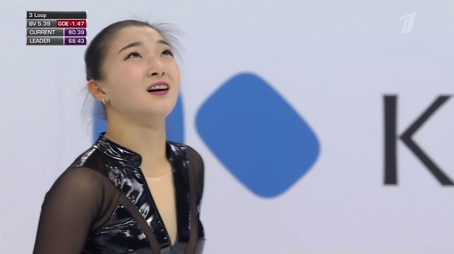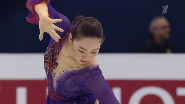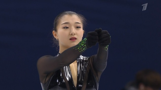 Сразу же заходит на четверной тулуп, но падает. Тройной флип приземляет на две ноги, но зато на +1,5 исполняет тройной лутц. Четко делает каскад 3 сальхов — 3 тулуп. Во второй части проката каскад 3 риттбергер — 2 тулуп, каскад 2 аксель — тулуп — 2 тулуп. А вот с тройным риттбергером не справилась, опять плохо приземлившись из-за недостаточной высоты и, похоже, недокрута. В итоге получилось явно ниже уровня, на котором японка может выступать.