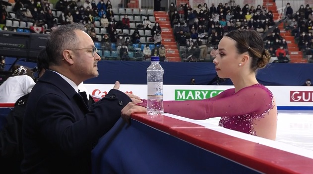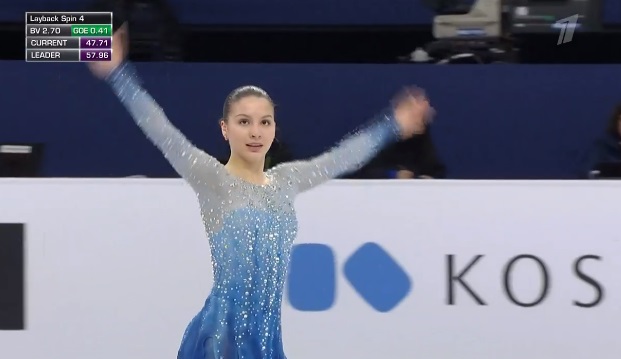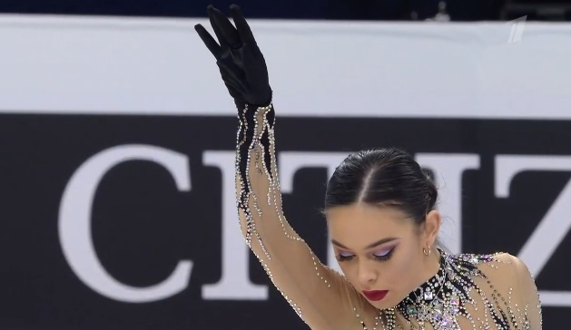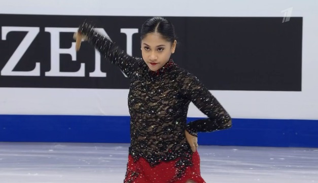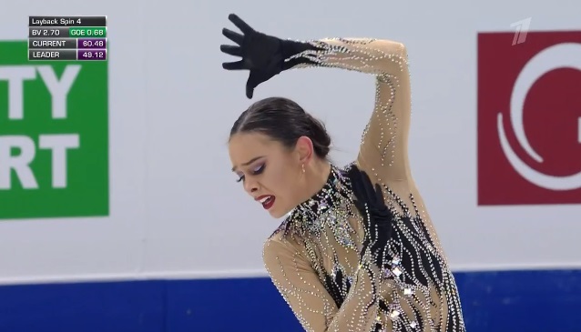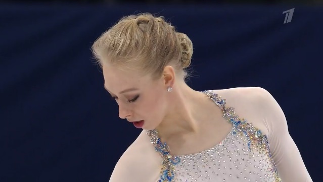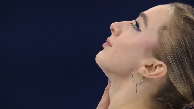 На тройном лутце сразу же не самое удачное приземление, а с этого же прыжка, который должен был стать первым в каскаде, и вовсе последовало падение. Дальше каскад 2 аксель — 2 тулуп сделала нормально. Грязновато в целом исполняла программу. Тройной сальхов не самый удачный во второй части, без плюса и только двойной риттбергер, не лучший двойной аксель, только второй уровень за дорожку. В общем, на закончившемся вчера юниорском первенстве России она заняла бы последнее место уверенно.