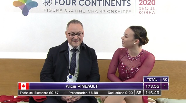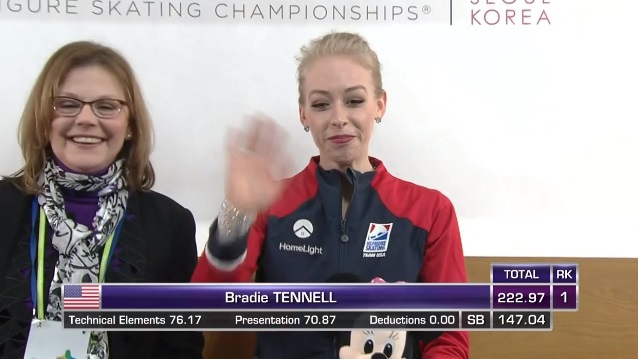 Запнулась на приземлении каскада 3 лутц — 3 тулуп, затем хорошо сделала двойной аксель, еще лучшей тройной сальхов и хорошо еще один двойной аксель. У Теннелл четвертый уровень за дорожку шагов, каскад 3 лутц — 3 тулуп во второй части уже без ошибок, каскад 3 флип — 2 тулуп — 2 риттбергер — тоже на плюс. Тройной риттбергер сольно тоже достойным вышел (+1,27). И вроде без четверных, а очень серьезное выступление американки!