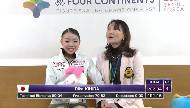 Ну и вот результат Кихиры. Первая в произвольной, убедительно первая по сумме! Чемпионка турнира четырех континентов!