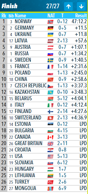 Россия на смене этапы проигрывает 14 секунд сборной Швеции. Норвегия и Украина — в лидерах.
