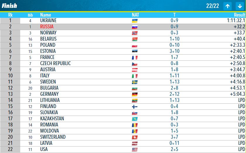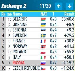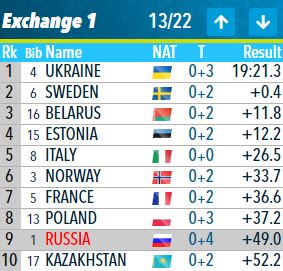 Провальный этап от Сливко. Девятой финишировала Виктория, проиграв лидеру минуту и 19,7 секунды. Сложная задача стоит перед Эдуардом Латыповым, который бежит третий этап эстафеты.