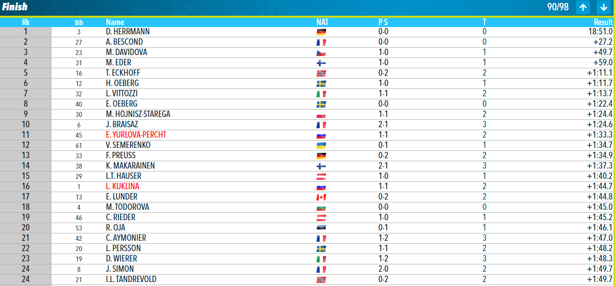Екатерина Юрлова-Перхт финишировала. Пока что 11-е место занимает Екатерина, с двумя промахами она проиграла Херрман минуту и 33,3 секунды. Ну, в пасьюте еще может претендовать на место в топ-10.