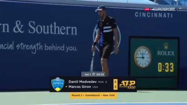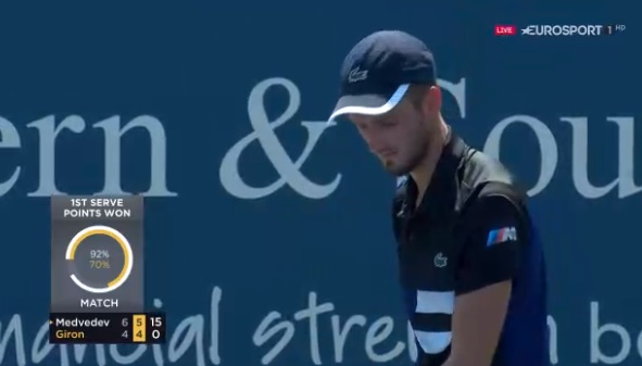 Гирон атакует со второй подачи россиянина, но Медведев ударом в угол вынуждает соперника ответить слишком длинно — 15:15.