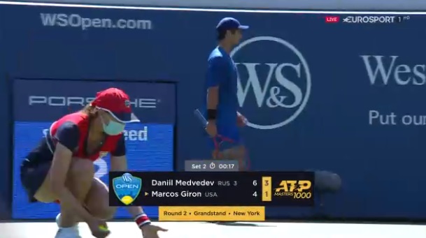 Пошел вперед Гирон с подачи и грубо ошибся — 15:40, два брейк-пойнта у Медведева.