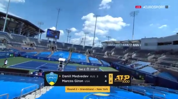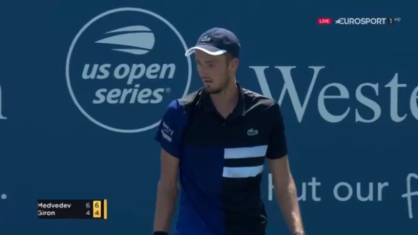 Очень долгий и красивый розыгрыш со второй подачи. Сначала большой перевес был у Даниила, но затем сначала Гирон вернулся в игру, а дальше и сам Медведев упустил инициативу. Но ошибся в итоге все равно американец — ровно.