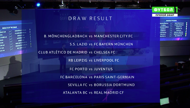 Список несеяных команд жеребьевки ЛЧ (тех, что заняли второе место в своей группе): «Атлетико», «Боруссия» (Менхенгладбах), «Порту», «Аталанта», «Севилья», «Лацио», «Барселона» и «РБ Лейпциг».