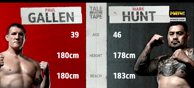 Любопытно, что Хант оказался тяжелее экс-регбиста Галлена на целых 23,5 кг! Вес Ханта — 127,1 кг, а 39-летнего Галлена — 103,6 кг.