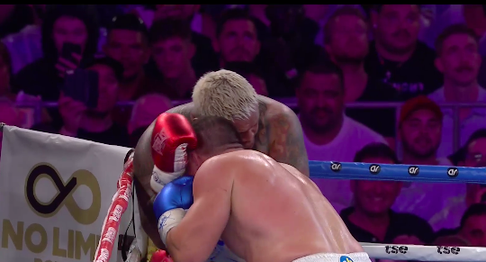 Галлен грамотно зажал Ханта в углу ринга и снова начал избивать его мелкими ударами с ближней дистанции, на которые грузный оппонент никак не может ответить.