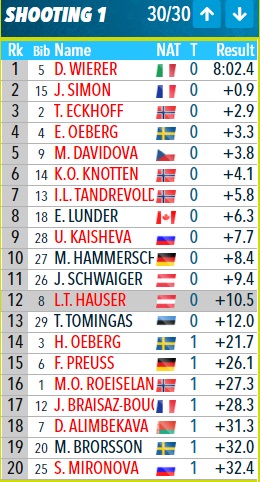Первая стрельба: Вирер и Экъофф быстрее всех точно отстрелялись из лидеров. У Ульсбю-Ройселанд один промах, Ханна Оберг тоже разок промазала, в отличие от своей сестры Эльвиры.