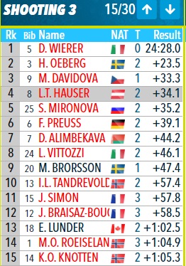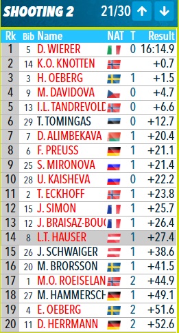 Вторая стрельба: Вирер пришла на третью позицию, но отстрелялась первой и чисто! Впрочем, сразу за ней норвежка Кноттен и Ханна Оберг. Чуть отстает также сработавшая чисто чешка Давидова (+4,7).